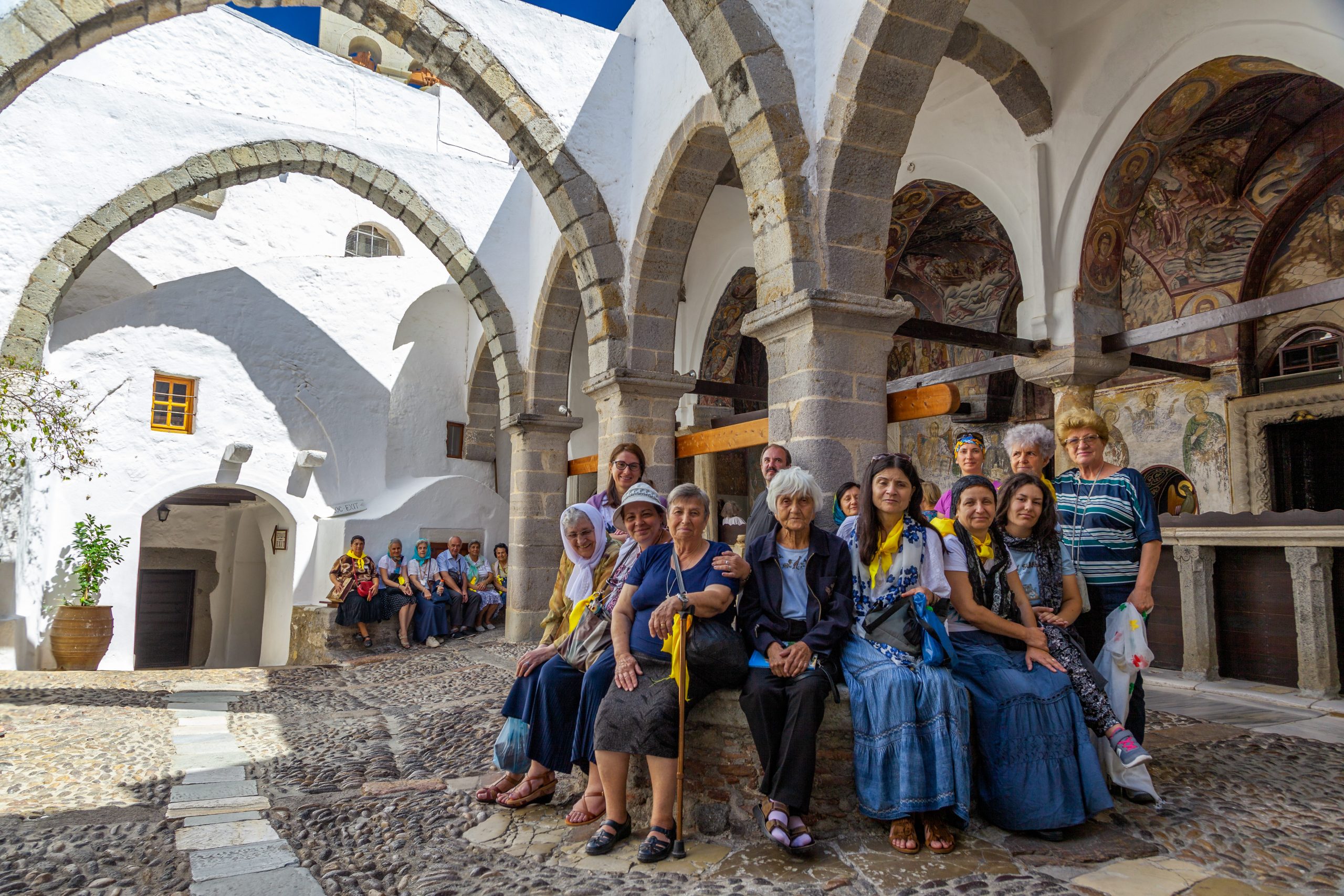 În insula Patmos ne-am închinat în Grota Apocalipsei – locul unde a stat și a scris Sfântul Ioan Evanghelistul Apocalipsa, în anul 96. Pașii pelerinilor au mers apoi la mănăstirea Sfântul Ioan Evanghelistul (ctitorită în 1088 de către monahul Hristodul). Mănăstirea este construită sub formă de fortăreață și din 1999 a intrat în patrimoniul mondial UNESCO.
